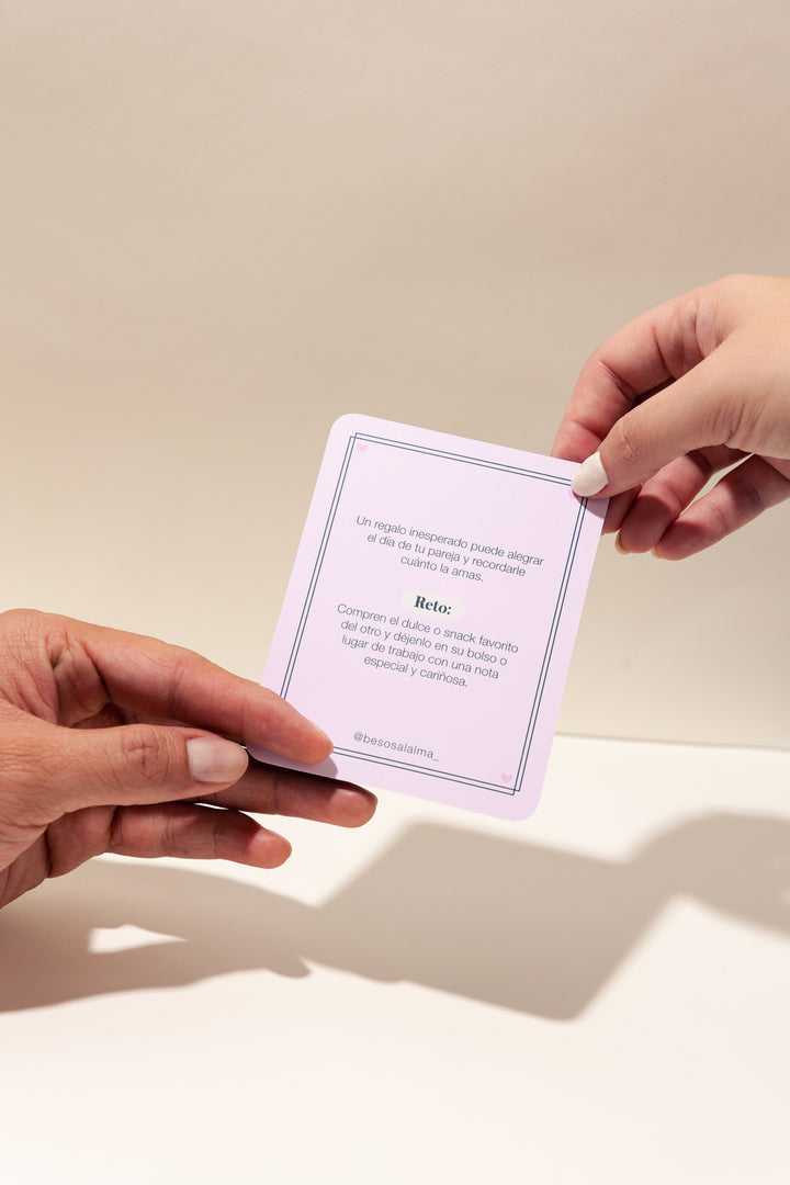 Inspirado en los 5 lenguajes del amor, este oráculo fue creado para ayudarlos a hablar con el corazón, salir de la rutina y volver a mirarse con intención. Cada carta trae un mensaje y un reto diseñado para abrir espacios de conexión real, emoción y complicidad.